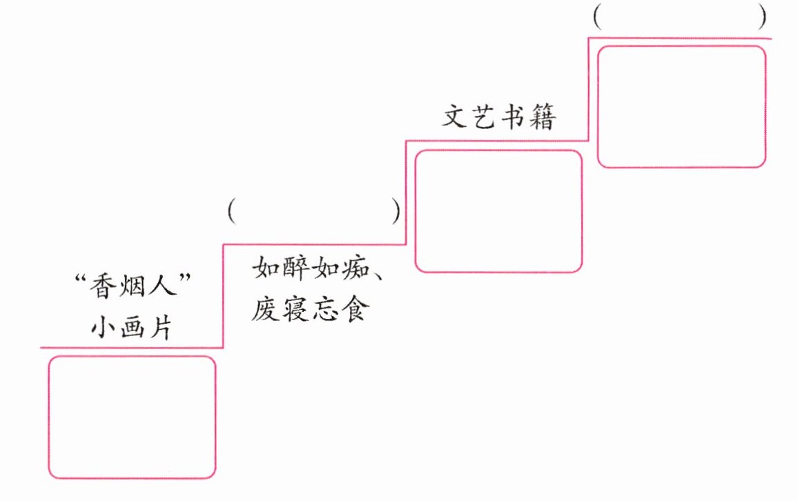 答案:从左至右:津津有味 连环画 囫囵吞枣、不求甚解 古今中外的大部头小说 着迷