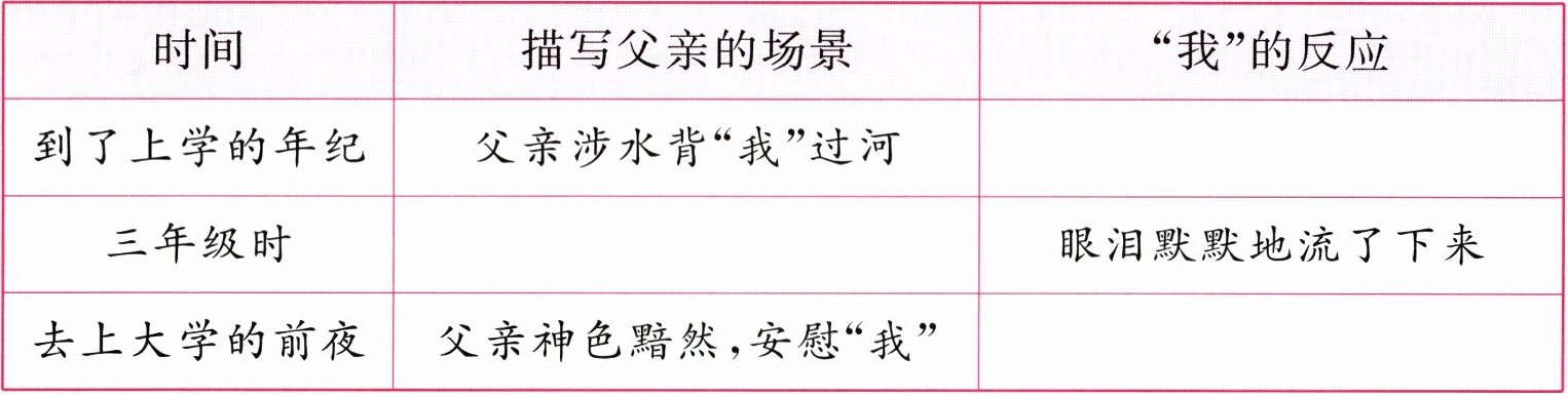示例:② 这句话通过描写父亲的神态和语言,让“我”感受到父亲不想让“我”担心,又舍不得“我”离开的心理