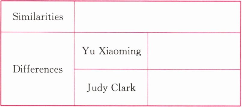 答案:One possible answer: Similarities 1. spend / celebrate his / her birthday with his / her family 2. have a good time on that day 3. ...(言之有理即可) Differences Yu Xiaoming 1. eat birthday noodles with eggs 2. take a photo with his family Judy Clark 1. have a party with her friends 2. enjoy the birthday cake and open gifts 3. mark her height on the door