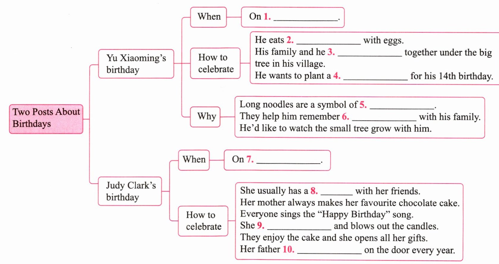 答案:1. 13th June 2. birthday noodles 3. take a photo 4. small tree 5. long life 6. fun times 7. 28th July 8. party 9. makes a wish 10. marks her height