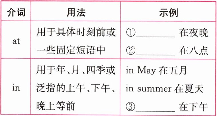|at|用于具体时刻前或一些固定短语中|①at night 在夜晚