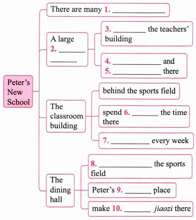 答案:1. modern buildings 2. sports field 3. next to 4. do exercises 5. raise the flag 6. most of 7. change seats 8. across from 9. favourite 10. delicious
