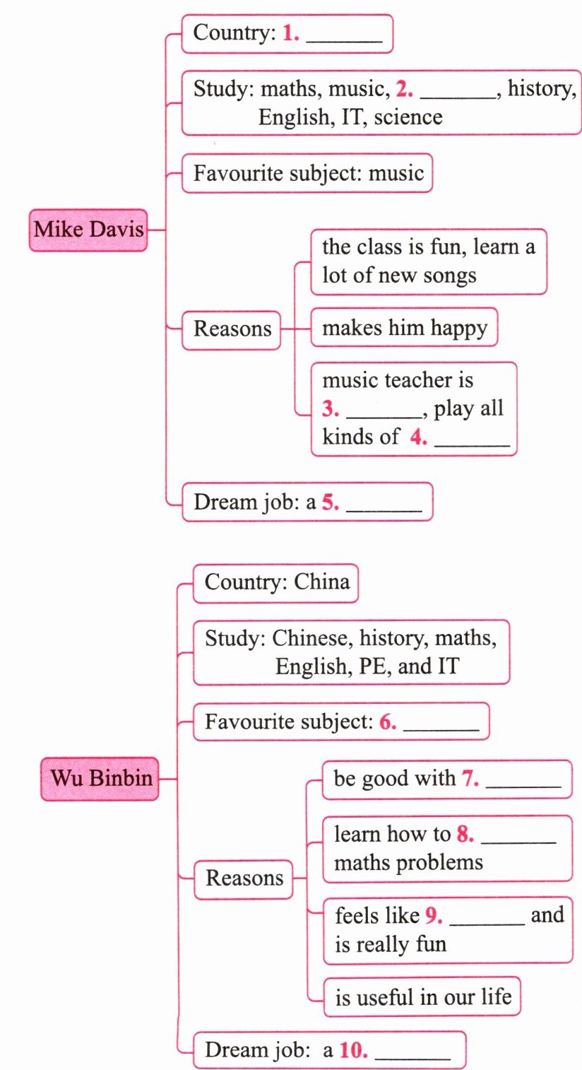 Mike is a student in Canada. He has maths, music, French, history, English, IT, science and gym this term. His favourite subject is music. He likes it because the class is fun and he learns a lot of new songs. He wants to be a singer in the future.