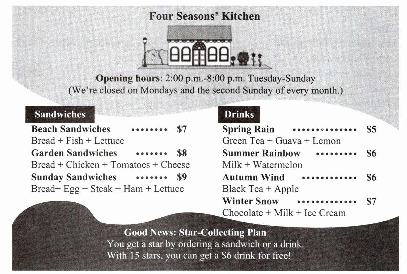 ) 2. Amy went to Four Seasons' Kitchen with her mother after she collected 15 stars. They ordered two Garden Sandwiches, an Autumn Wind, and a Winter Snow. After using the stars, how much did they pay for their meals?