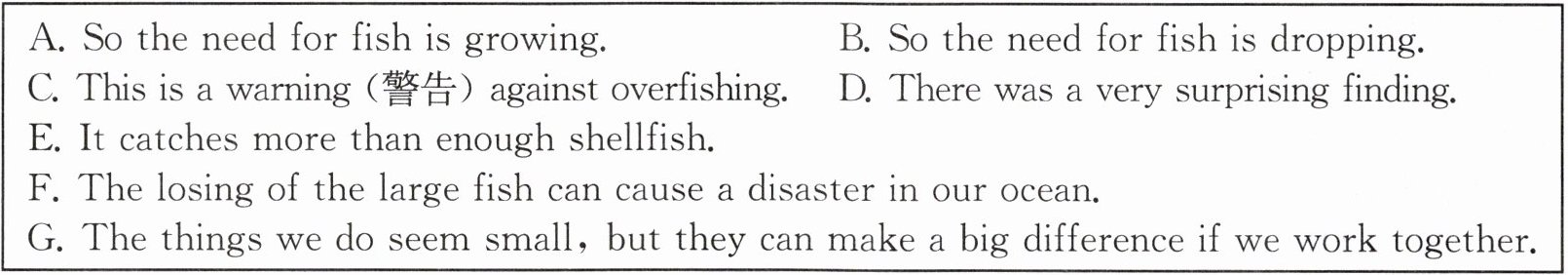 解析:前面说“作为学生,我们也可以尽自己的一份力”,后面说“多年后能看到不同的鱼”,说明我们做的小事能有大作用,所以是“我们做的事情看起来很小,但如果我们一起努力,就能产生很大的影响”,对应选项G。