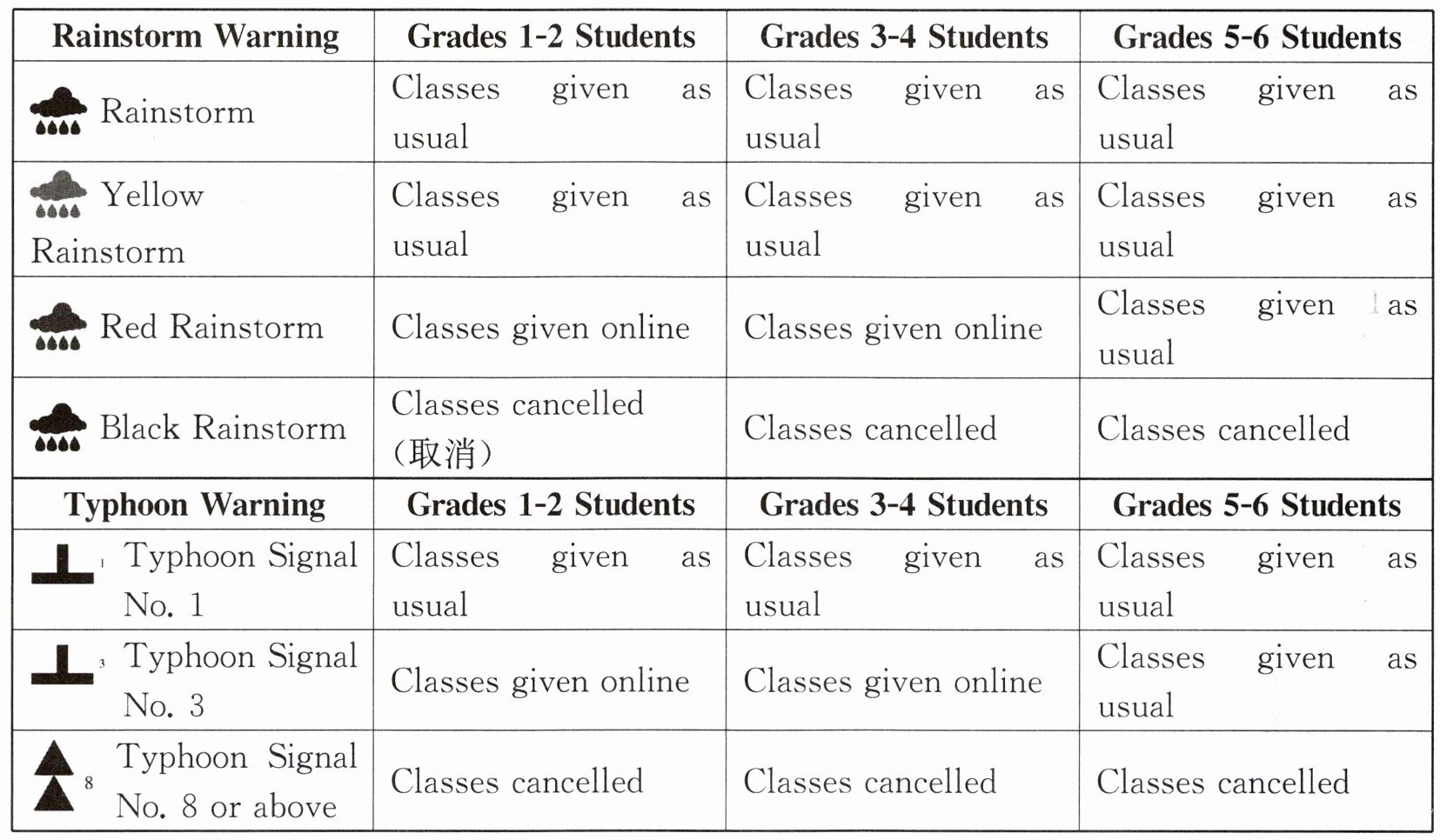 1. If Typhoon Signal No. 8 or above/Black Rainstorm is announced (宣布) during on-school lessons, students can leave the school if brought back by a parent.