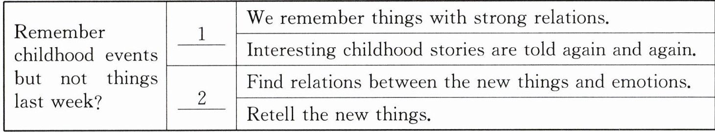 A1: We remember things that have strong relations (关联) in our mind, especially emotional (情绪的) ones. Childhood memories are often these, because when we experience things for the first time, we often have strong feelings of fear (害怕) or excitement. Also, interesting or funny childhood stories are often told again and again. As a result, we remember them much better, as retelling (复述) events helps fix experiences in our memories. So when remembering something new, find its relation to our emotions, or retell it to others.