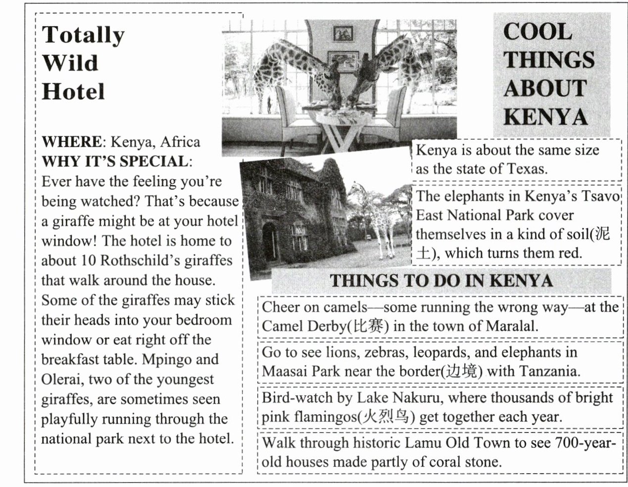A. 介绍一家特别的酒店。 B. 谈论肯尼亚的野生动物。