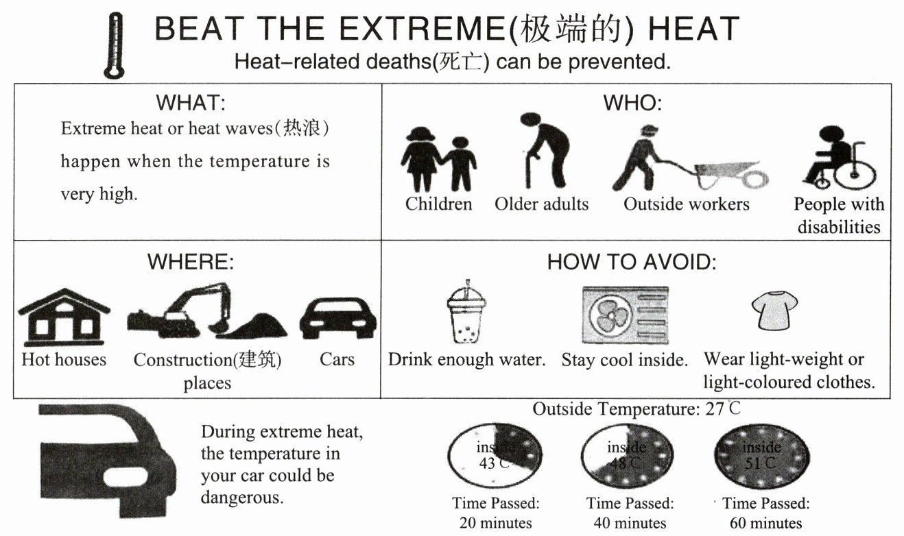 A. tell people not to stay in the car B. tell people the cause of extreme heat