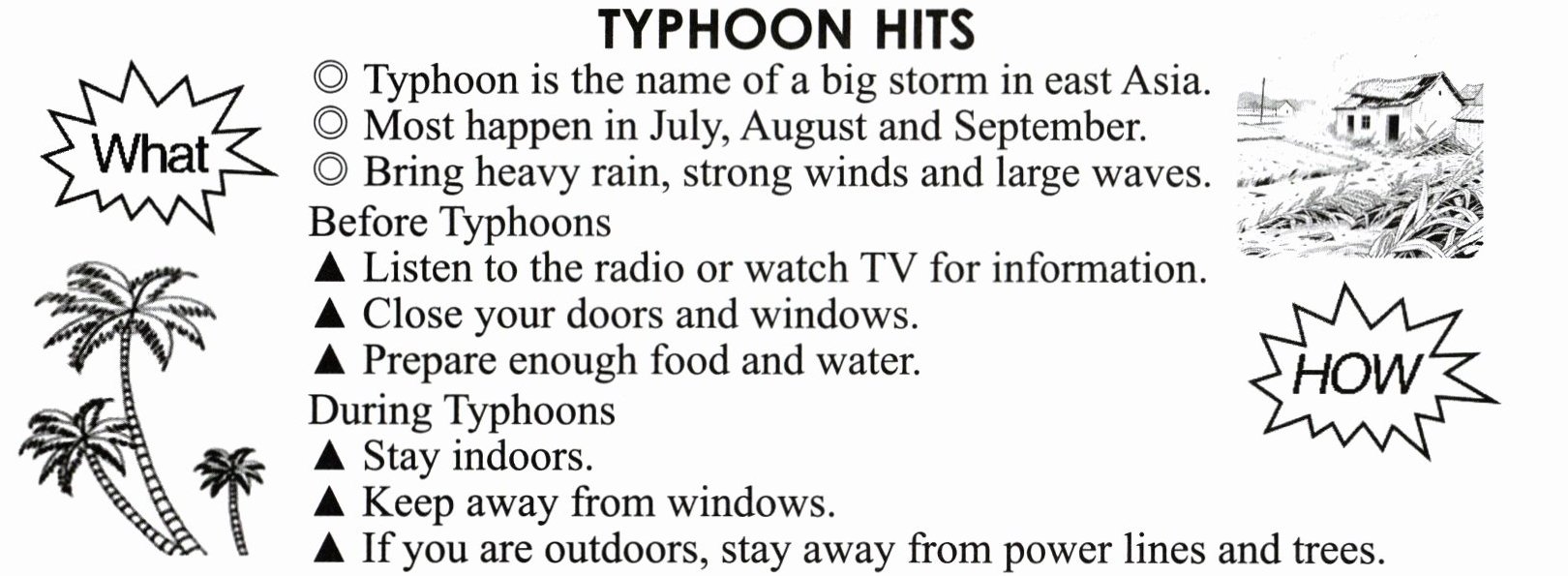 Then ▲. The temperature dropped suddenly. I looked up and saw the sky now turned dark green. Trees and crops were bent (弯曲) over by the wind. No animals were in sight.
