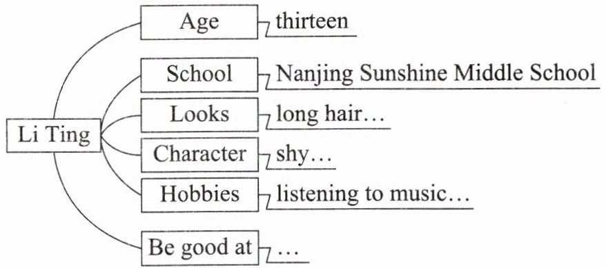 嗨,大家好!我是李婷。我的英文名字是苏珊。我十三岁了。现在我在南京阳光中学学习。我有点矮,但看起来很可爱。我有一双大眼睛、一个小鼻子和一头长发。我总是很害羞、很安静。我不太喜欢多说话。我非常喜欢听音乐。音乐总是能让我开心。我也喜欢跳舞,而且我很擅长跳舞。我将来想成为一名舞蹈家。