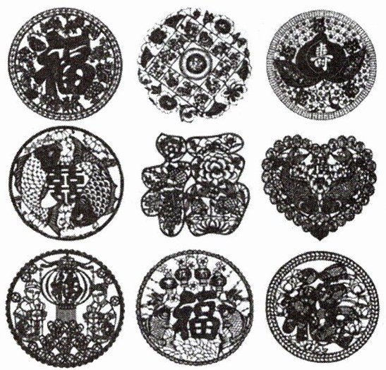 Paper - cutting has wonderful meanings — happiness and good luck. At the Spring Festival, people put up fu on doors or windows. At a wedding (婚礼), people put up xi.