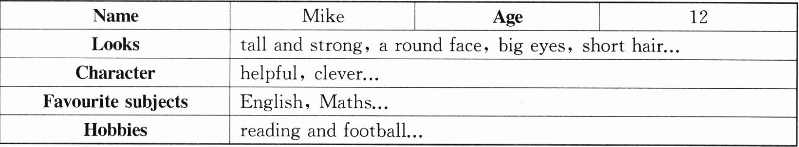 答案:This Is Me Hello, my name is Mike. I’m 12 years old. I’m tall and strong. I have a round face, two big eyes and short hair. My friends say I look really cool. I’m helpful. I often help my classmates when they have problems. What’s more, I think I am clever. I do well in all the subjects. And my favourite subjects are English and Maths. In my free time, I like reading. Reading makes me feel happy. And I also like playing football. I often play football with my classmates after school. This is me. How about you?