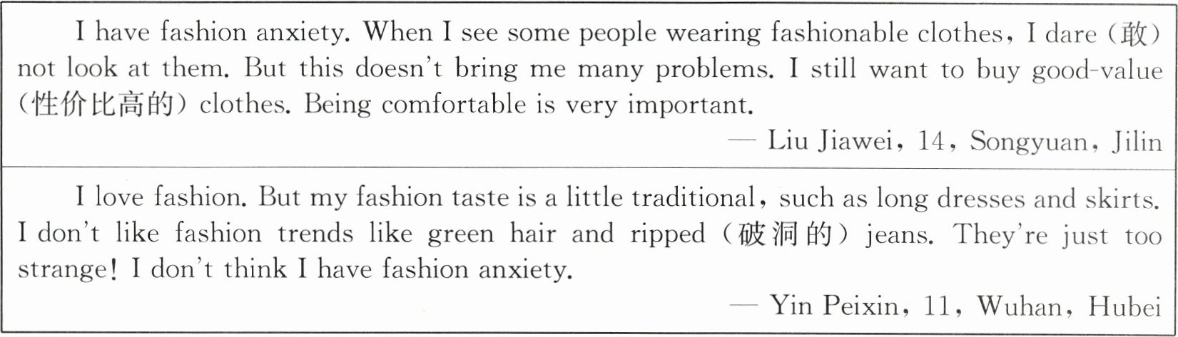 Li Meixi is a 12-year-old girl from Chengdu. When she sees fashionable people on the street, she tries to keep away from them. “I am afraid that they think I’m out of fashion,” says Li. This is called fashion anxiety(焦虑).