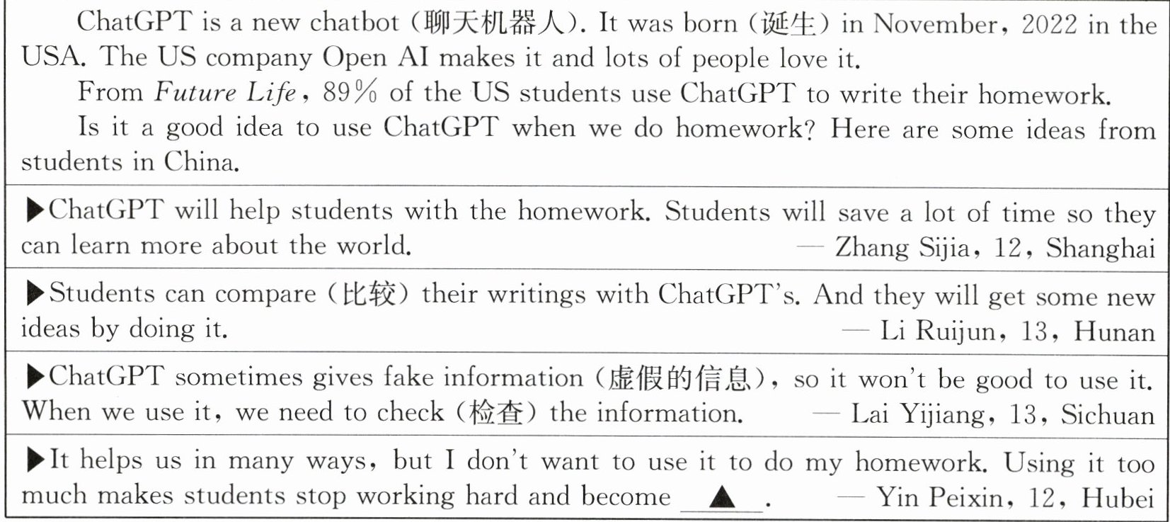 答案:1. In November,2022. 2. 89%. 3. Lazy. 4. Zhang Sijia and Li Ruijun. 5. It is smart/great./It can make us stop thinking.