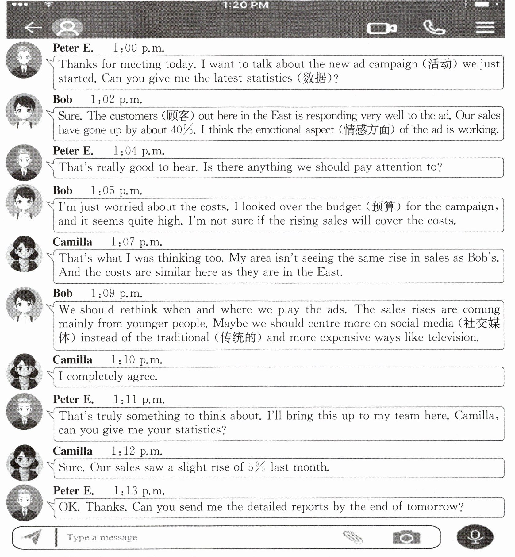 )1. What does Camilla say about the sales in her area?