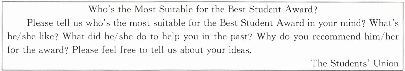 答案:Dear Chairperson, I would like to recommend Zhou Li for the Best Student Award. I think she has many strong qualities for this award. Zhou Li is clever and hard-working. She often comes first in the exams in our class. She is modest, polite and confident. She can do everything well if she tries her best. She is also helpful. I was once absent from class for a month because of illness. She came to my home to help me with my lessons almost every day. Zhou Li is organized and patient. She often explains all kinds of difficult problems to us patiently. I think Zhou Li is the most suitable person for the award. I hope that you can agree with me. Yours, Millie