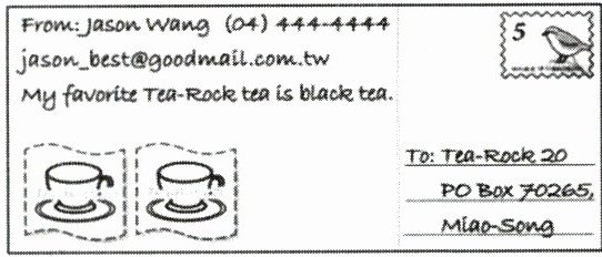 ) 2. Here is the postcard Jason is going to send to Tea-Rock 20. What else does he need to put on the postcard before he sends it?
