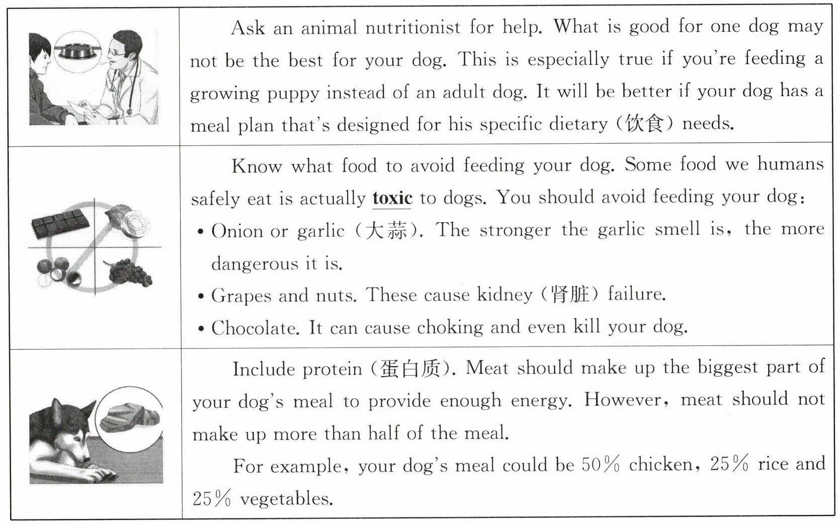 There are many reasons to prepare your dog’s food. He might be a picky eater, or you may want to avoid giving him additives (添加剂) in the dog food you buy, or maybe you just want to show your dog some love. If you only make a homemade healthy meal sometimes, don’t worry too much about balancing the nutrition (营养) about it. However, if you plan to feed your dog homemade meals for a long time, you’ll need to consider more about it.