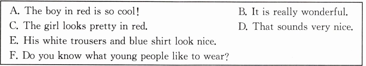 It will be Mr Green's birthday next Thursday. Mrs Green wants to buy a new shirt for him. She goes through many clothes shops. Soon she finds a good one. She thinks this new blue shirt and Mr Green's black trousers are a good match(搭配). It's 145 yuan. Mrs Green takes it at a 20% discount(折扣) at last.