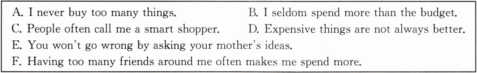 First of all, I like reading, so I spend 20 per cent buying some works of famous writers for myself. Second, I want to buy a new pair of shoes for my father, because his shoes are too old. Third, I’m going to buy hanfu for my mother. My mother likes traditional Chinese clothes a lot. Fourth, I plan to buy some presents for my friends to thank them for their help. The gifts cost about 60 per cent of my budget. Finally, I want to give the rest of my lucky money to the children in need.