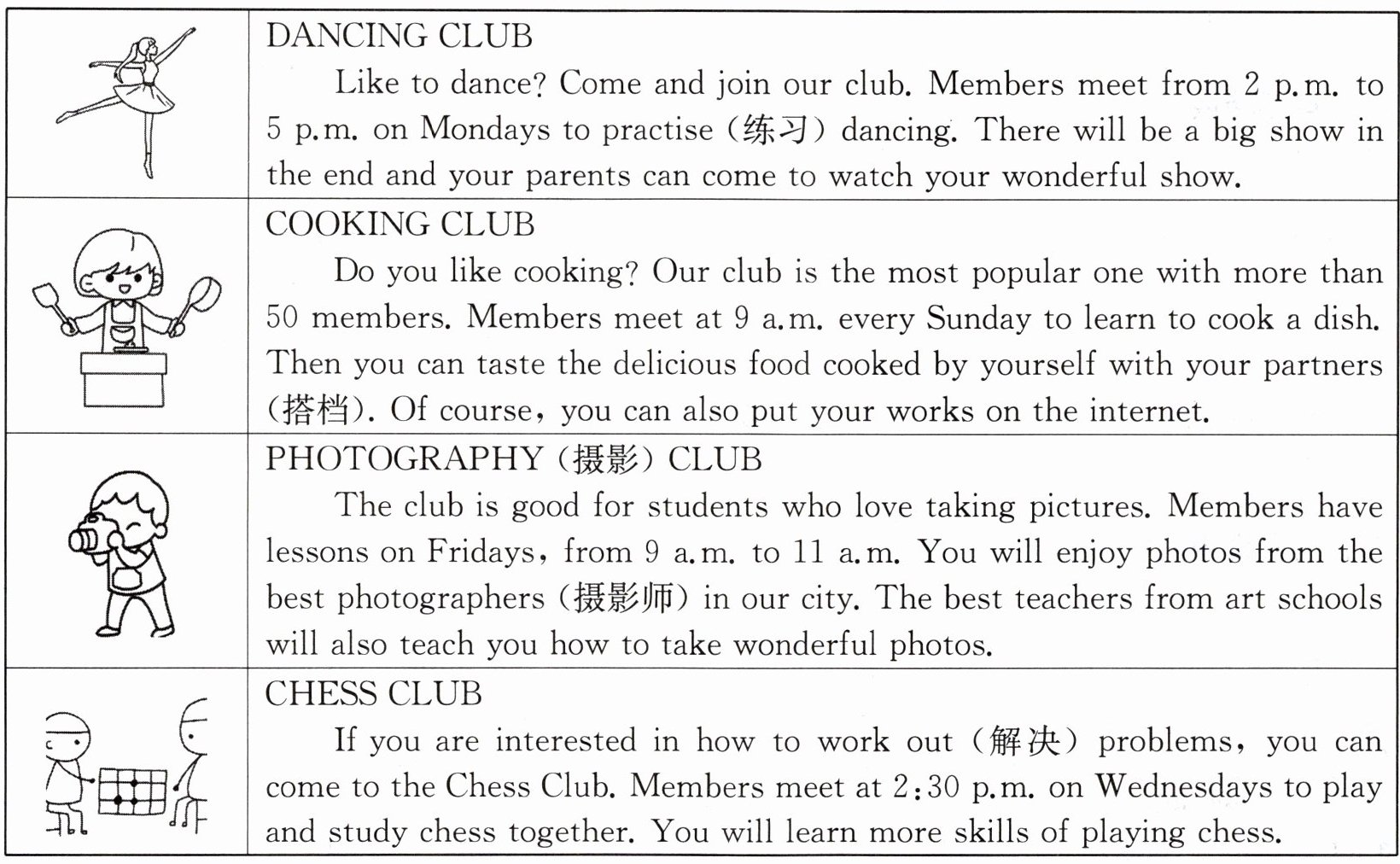 答案:1. Smart. 2. The members’ parents. 3. Once a week/Every Sunday. 4. Two hours. 5. The Chess Club.