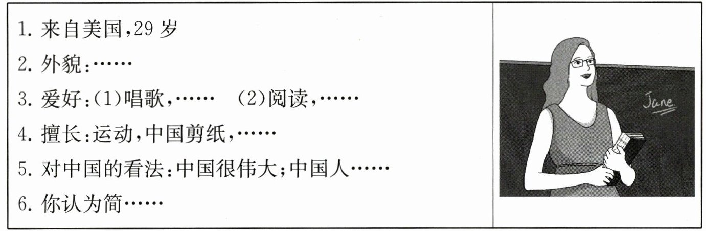 答案:Jane comes from the USA. She is 29 years old. She is tall and slim and she wears a pair of glasses. Her hair is long. She looks very young. She likes singing very much and she sings very well. She thinks singing can make people happy. She also enjoys reading. She thinks reading can help her learn more about the world. What’s more, she likes Chinese paper-cutting a lot.