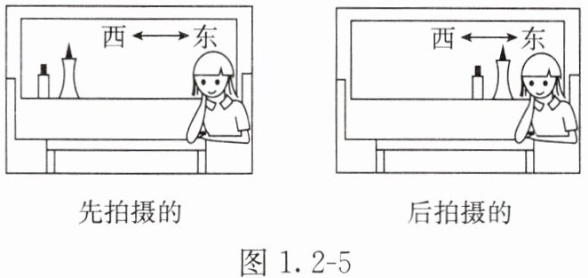 6. 小丽在朋友圈分享了自己外出旅行时的照片,其中两张是小丽坐在平直行驶的火车内连续拍摄的照片,如图1.2-5所示。小明判断小丽乘坐的火车正在向东行驶。小明的判断是