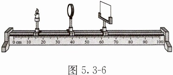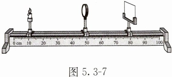 5. 小明做“探究凸透镜成像的规律”的实验,实验所用凸透镜的焦距为 $ f = 10\ cm $,他把凸透镜固定在光具座上 50 cm 处,调节蜡烛的烛焰、凸透镜和光屏,使它们的中心在同一高度,如图 5.3 - 7 所示。