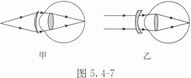 5. 小陈发现爷爷看报纸时将报纸拿得很远,根据所学知识想到人的眼睛与____(选填“照相机”“投影仪”或“放大镜”)的成像原理相同。爷爷眼睛的问题可能是因为晶状体太薄造成的____(选填“近”或“远”)视眼,于是他建议爷爷到眼镜店选配一副眼镜,矫正视力的原理如图5.4 - 7中____(选填“甲”或“乙”)所示。