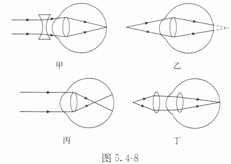 (1)近视眼的光路图是图5.4 - 8中的____,而矫正后则变为图中的____。(均选填“甲”“乙”“丙”或“丁”)