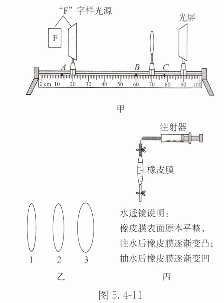 (2)用如图5.4 - 11丙所示的水透镜模拟近视眼矫正视力,应将水透镜置于光具座上的____(选填“A”“B”或“C”)点,缓慢调节水透镜中的水量,当水透镜形成焦距合适的____透镜时,光屏上呈现清晰的像,近视眼的成像情况得到改善。