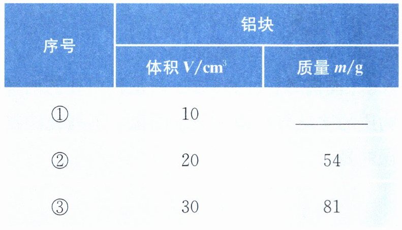 (2)改正错误后,其他操作无误,天平平衡时右盘砝码和游码在标尺上的位置如图6.2 - 1乙所示,请将铝块1的质量填写在表6.2 - 1中的空白处。小明接下来继续测量了铝块2和铝块3的质量并将数据记录在表中。