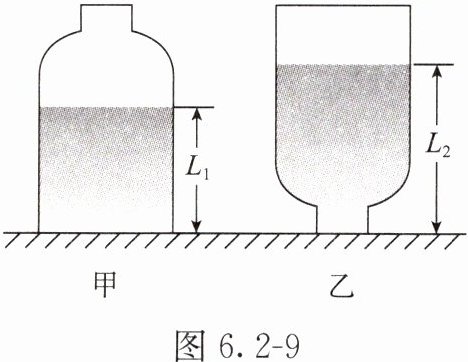 9. 薄壁瓶内装满液体,液体的质量为$360g$,小明要测量液体的密度。已知瓶的高度为$20cm$,瓶底的面积为$20cm^{2}$,他倒出部分液体后,首先将瓶正放,如图6.2 - 9甲所示,测出剩余液体的液面高度$L_{1}= 10cm$,则剩余液体的密度____(选填“变大”“变小”或“不变”);然后堵住瓶口,将瓶倒置,如图6.2 - 9乙所示,测出液面高度$L_{2}= 15cm$,则液体的密度为____$kg/m^{3}$。