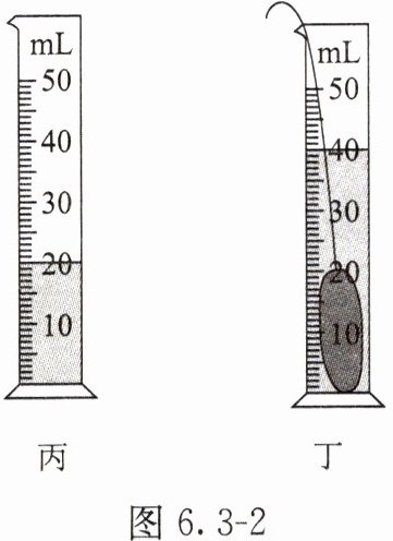 (3)用量筒测量岩石的体积。将水倒入量筒,液面达到的位置如图6.3 - 2丙所示,再把岩石浸没在水中,水面升高,如图6.3 - 2丁所示,则岩石的体积为______$cm^3$,该岩石的密度为______$g/cm^3$。