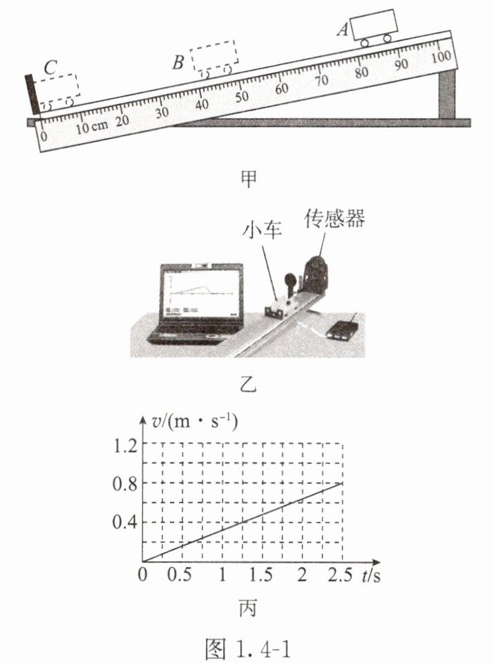 (4)传感器利用超声波可以测出在不同时刻小车与它的距离,然后计算机再根据时间就可以算出运动的小车在不同位置时的速度。如图1.4-1乙所示,小明重新调整斜面坡度,利用传感器再次进行实验。屏幕图像为如图1.4-1丙所示的$v-t$图像,从图像可以看出小车在斜面上下滑时做