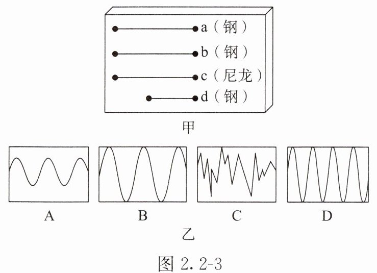6. 某小组同学利用长短、粗细、材料不同的琴弦来探究音调和哪些因素有关。他们选用的琴弦长度、粗细、材料如图 2.2 - 3 甲所示,其中琴弦 a、c、d 的粗细相同,琴弦 b 最粗;琴弦 a、b、c 的长度相同,琴弦 d 最短,并且每根琴弦固定在“音箱”上的松紧程度一致。