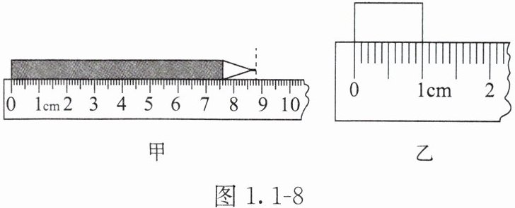(1)图1.1-8甲中刻度尺的分度值为____mm,铅笔的长度是____cm,小明用相同的刻度尺对这根铅笔进行了多次测量,所测得的数据均为8.50 cm,经过分析,导致该测量结果错误的原因可能是____。