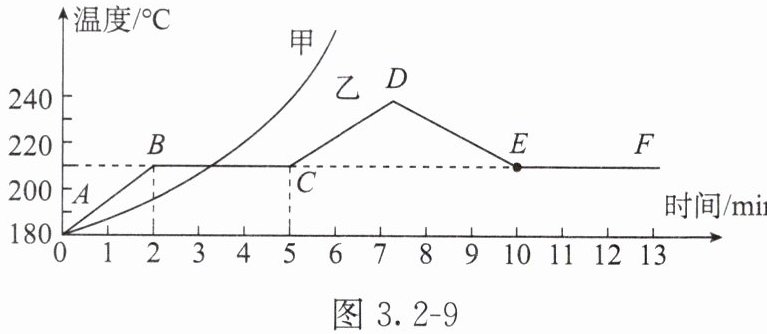 3. 两种物质熔化时温度随时间变化的曲线如图3.2 - 9所示,据图判断:属于非晶体的是物质____(选填“甲”或“乙”);若在$B$点对物质乙停止加热,则物质乙____(“会”或“不会”)继续熔化;当停止加热后,物质乙的温度随时间变化的图线是$DEF$,$E$点表示的物理含义是____。
