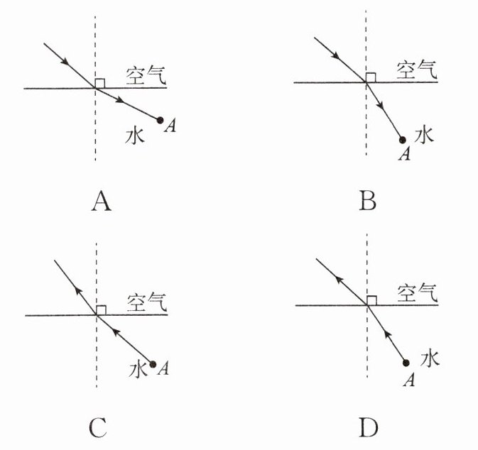 1. 下列能正确描述水中 $A$ 点鱼发出的光线射入岸上人眼中的光路图的是(