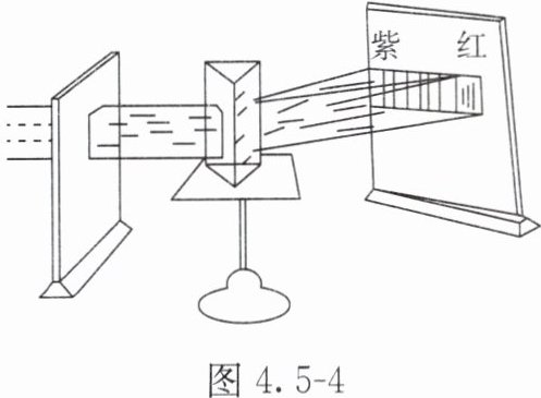 实验一:用平面镜引入一束日光,通过狭缝照到三棱镜上,如图4.5 - 4所示。调整三棱镜的方位,在白色光屏上可以看到白光通过三棱镜折射后得到包含七种颜色的彩色光带。把白纸放在三棱镜前,发现照到三棱镜上的光是白光,由此得知白光通过三棱镜折射后分解成各种颜色的色光。