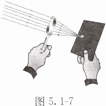 5. 如图5.1 - 7所示,某同学将凸透镜正对太阳光,在凸透镜的另一侧移动白纸,在距凸透镜10 cm时白纸上出现一个最小、最亮的光斑,该凸透镜的焦距是____cm。换成凹透镜再做这个实验,在纸上____(选填“能”或“不能”)看到很小、很亮的光斑。