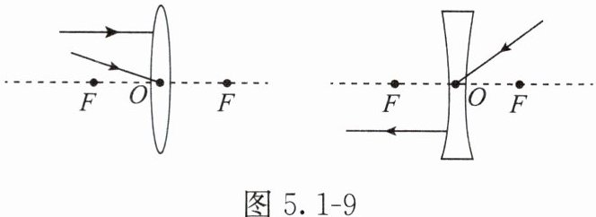 4. 在图5.1 - 6中,完成入射光线从左边射向凹透镜折射,再由凸透镜折射后的光路。