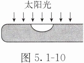 6. 如图5.1 - 10所示,在注有清水的试管内留有一个稍大的空气泡,使太阳光从试管的正上方向下照射,观察试管下方的白纸,可以发现白纸上与空气泡相对应的位置较____(选填“亮”或“暗”),这是因为气泡与周围水组成____透镜,太阳光射向空气泡和它下方的水后,出射光线会被____(选填“会聚”或“发散”)。