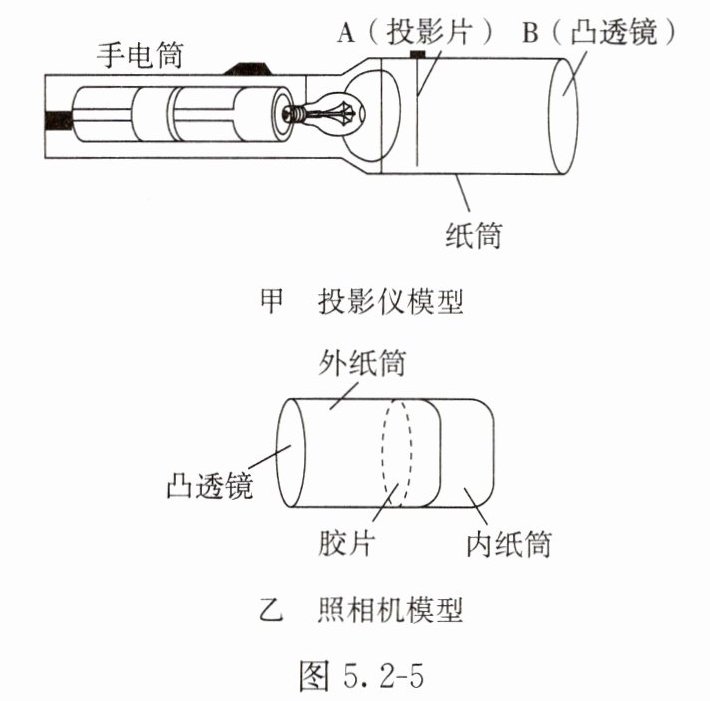 7. 某物理兴趣小组的同学用焦距为10cm的凸透镜和其他素材自制了照相机模型和投影仪模型,如图5.2-5所示。