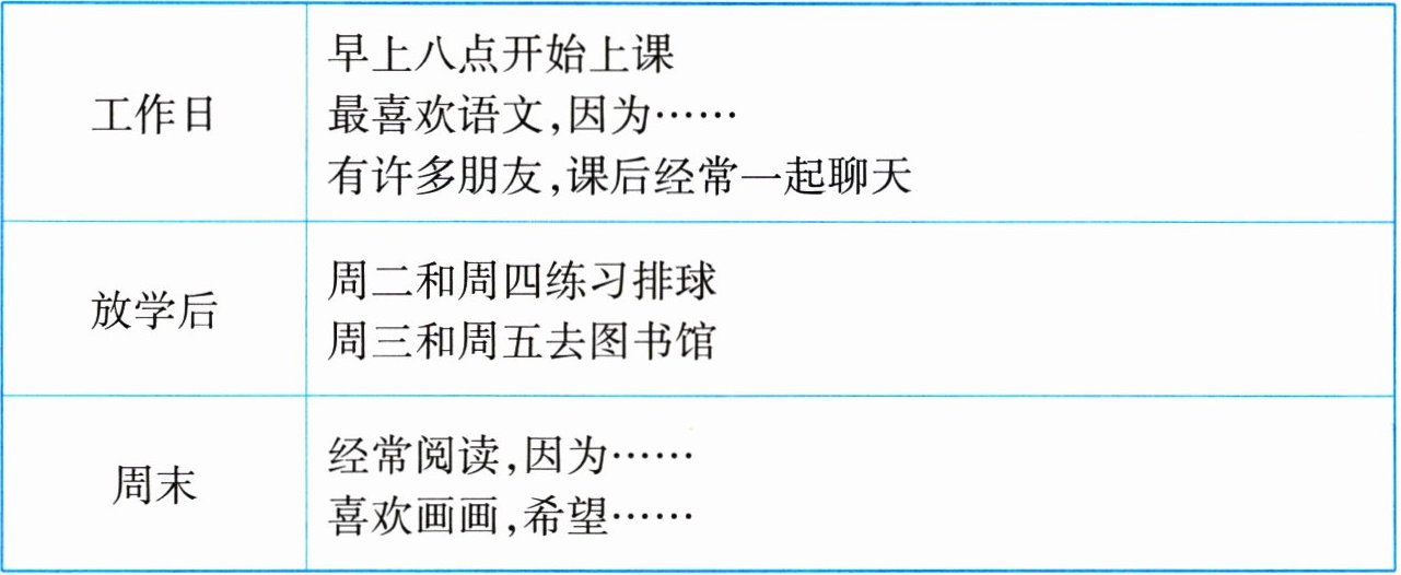 答案:One possible version: My new friend Xiaowen is a student at No. 1 Middle School. On weekdays his school starts at eight in the morning. He likes Chinese best because he thinks the Chinese language is really amazing. He has a lot of friends and they often chat with each other after class. He likes the after-school activities. He practises volleyball on Tuesdays and Thursdays, and he goes to the library on Wednesdays and Fridays. At weekends, he often does some reading because he can learn about the world from books. He enjoys painting too. He hopes to be an artist in the future.