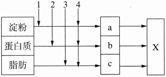 5. 右下图表示人体的消化和吸收过程,1~4 表示消化液,纵向箭头表示消化液对相应物质的消化作用,a、b、c 分别表示淀粉、蛋白质和脂肪的最终消化产物。下列说法正确的是( )