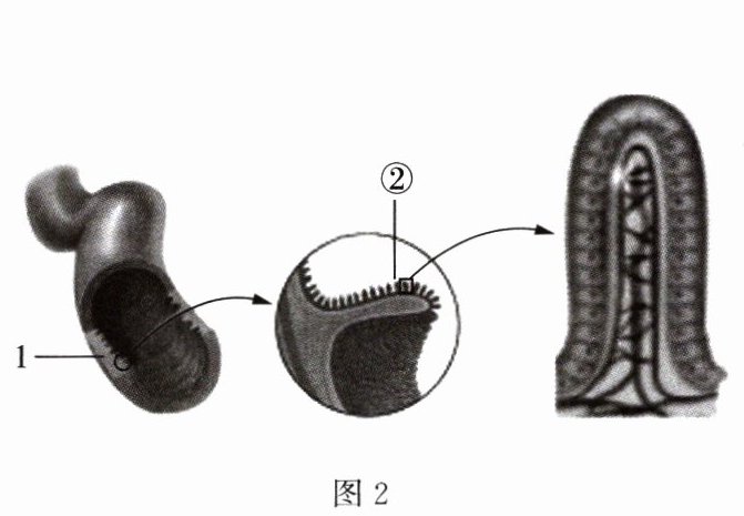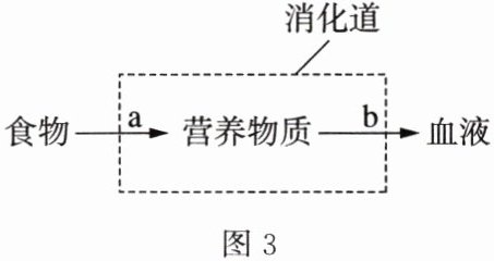 (3)饭后,各种物质在某同学体内发生了如图 3 所示的变化,a、b 表示生理过程,其中 b 表示的是______,a、b 过程发生的主要部位是图 1 中的[ ]______,与其功能相适应的结构是具有图 2 中的皱襞和______。