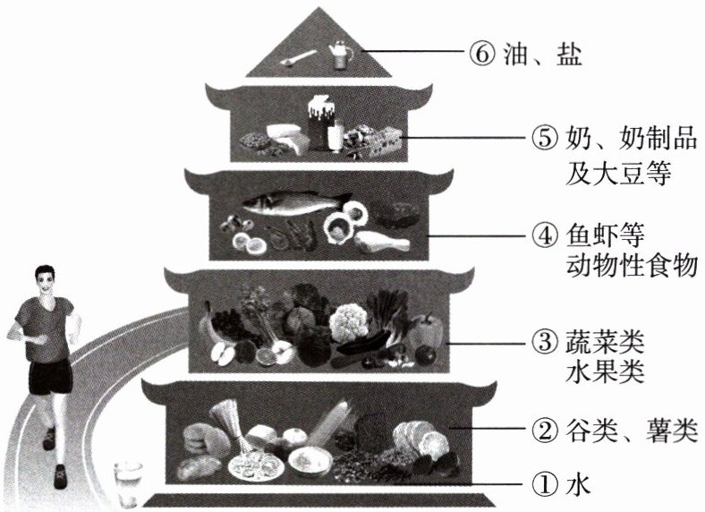 中秋假期,小明同学为全家做了一顿晚饭。他设计的食谱中有清蒸鲈鱼、炖排骨、蛋花汤、米饭、牛奶。下图是2022年发布的中国居民平衡膳食宝塔。请据此回答1~4题。