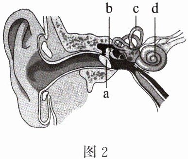 (2)鞭炮炸响产生的声波刺激图 2 中的[d]______内感受器产生神经冲动,传到大脑皮层中的一定区域形成听觉。